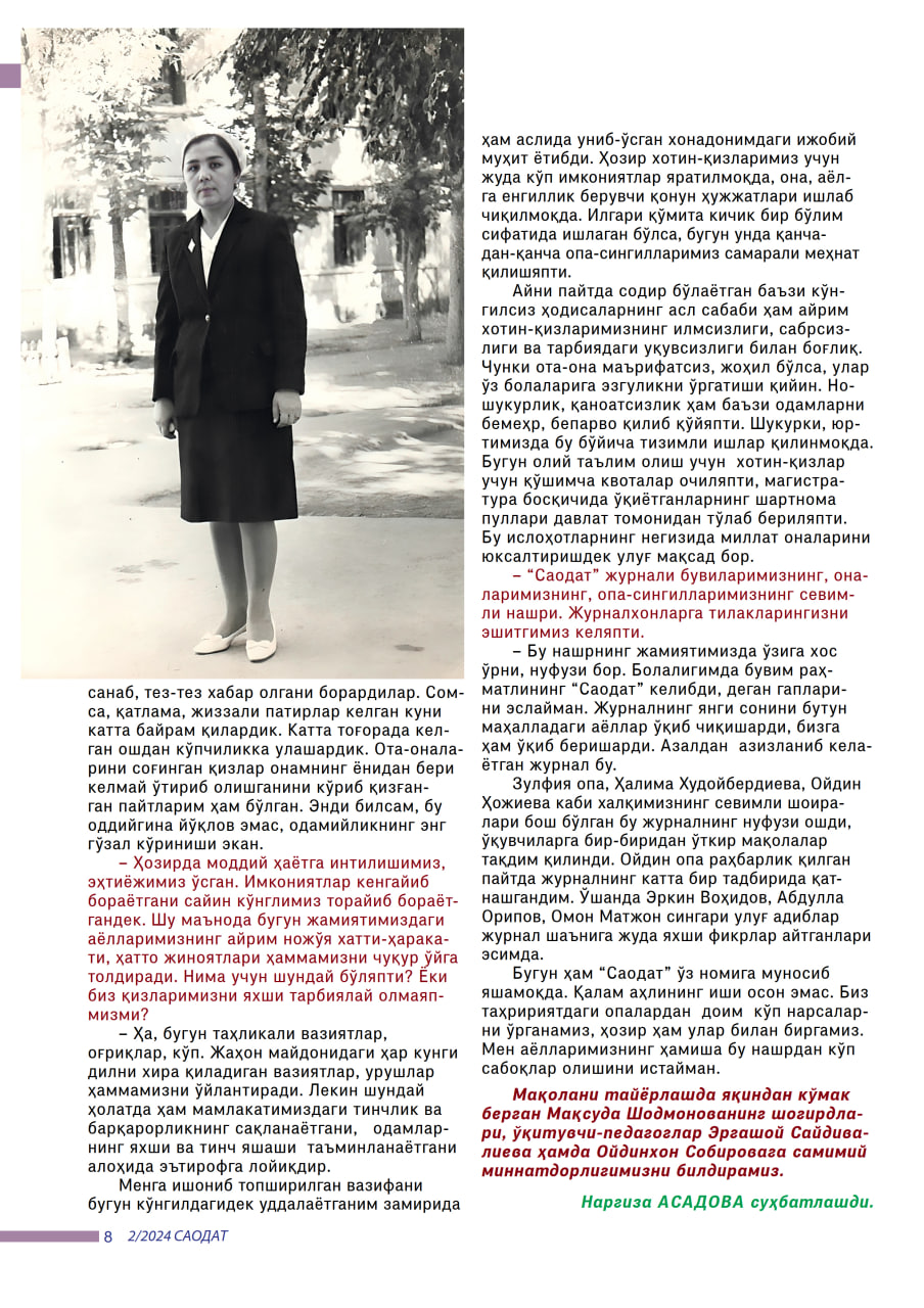 Бугун ҳам “Саодат” ўз номига муносиб яшамоқда. Қалам аҳлининг иши осон эмас. Биз таҳририятдаги опалардан доим кўп нарсаларни ўрганамиз, ҳозир ҳам улар билан биргамиз. Мен аёлларимизнинг ҳамиша бу нашрдан кўп сабоқлар олишини истайман.
