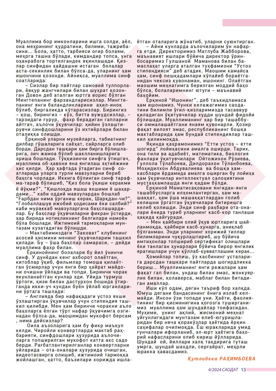 – Бир муаллимамиз таълимда янгиликлар қилаётган экан. Ишларидан хабардор бўлган заҳотим бу аёл “Саодат”нинг, яна ҳам аниқроғи, сизнинг қаҳрамонингиз экан, деб ўйладим. “Мактаб, ўқувчилар”, деган тушунчалар жон томирингизга туташ эканлигини биламан-ку...