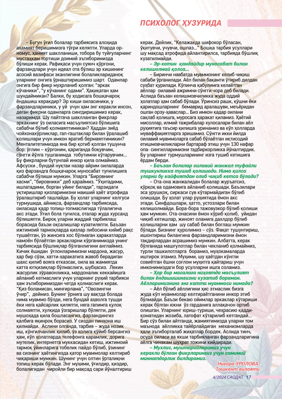 – Ота-она жанжалидан болалар журъатсиз, қўрқоқ ва одамовига айланиб қолишади. Баъзилари эса урушқоқ, сиркаси сув кўтармайдиган бўлиб олишади. Бу ҳолат улар руҳиятида ёмон акс этади. Синфдошлари, ҳатто, устозлари билан келишолмайди. Бора-бора тажовузкор бўлиб қолиши ҳам мумкин. Ота-онасини ёмон кўриб қолиб, уйидан чиқиб кетишлар, жиноят оламига дахлдор бўлиб қолишларни ҳам шу сабаб билан боғлаш мумкин бўлади. Бизнинг қуролимиз – сўз. Фақат тушунтириш, ишонтириш билангина фарзандларимизни ёмон тақдирлардан асрашимиз мумкин. Албатта, керак бўлганида машғулотлар билан чекланиб қолмаймиз, турли ташкилотларга борамиз, муҳокамаларда иштирок этамиз. Муҳими, шу ҳаётдан кўнгли совиётган ёшни соғлом муҳитга қайтариш учун имконимиздаги бор усулларни ишга соламиз.