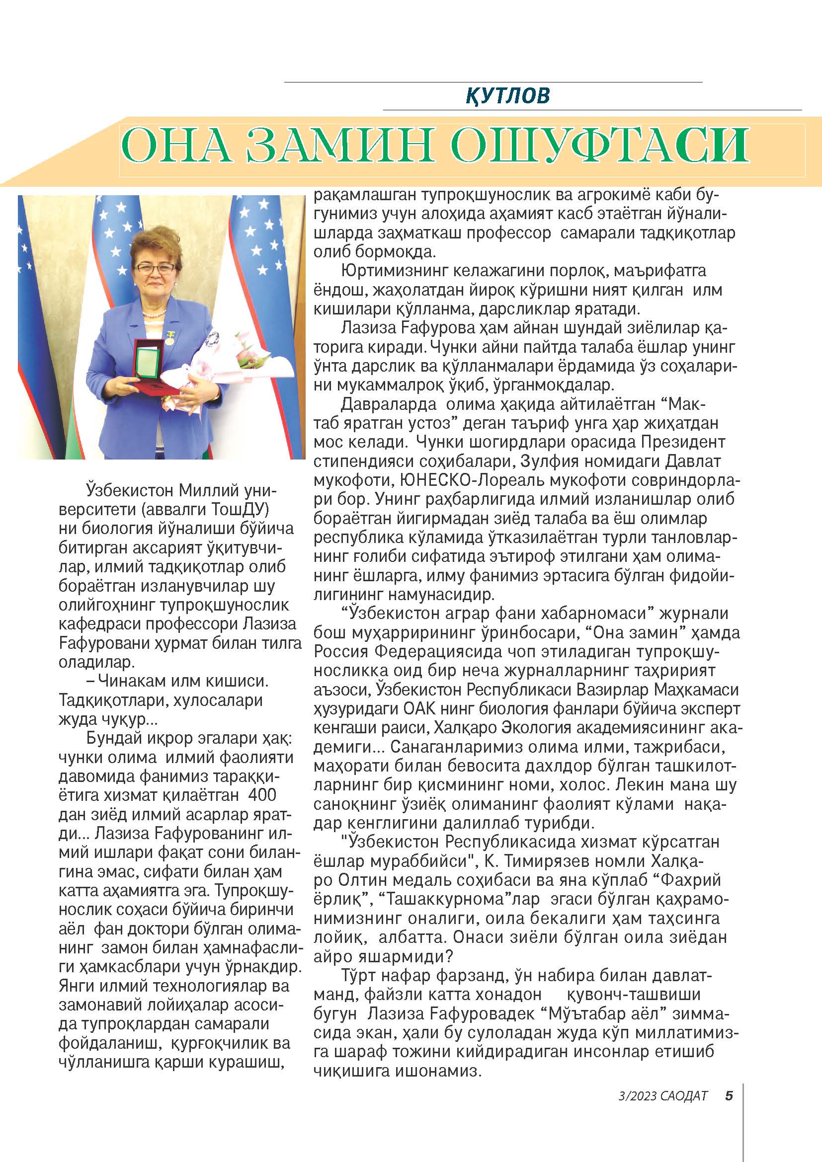 Ўзбекистон Миллий университети (аввалги ТошДУ)ни биология йўналиши бўйича битирган аксарият ўқитувчилар, илмий тадқиқотлар олиб бораётган изланувчилар шу олийгоҳнинг тупроқшунослик кафедраси профессори Лазиза Ғафуровани ҳурмат билан тилга оладилар.