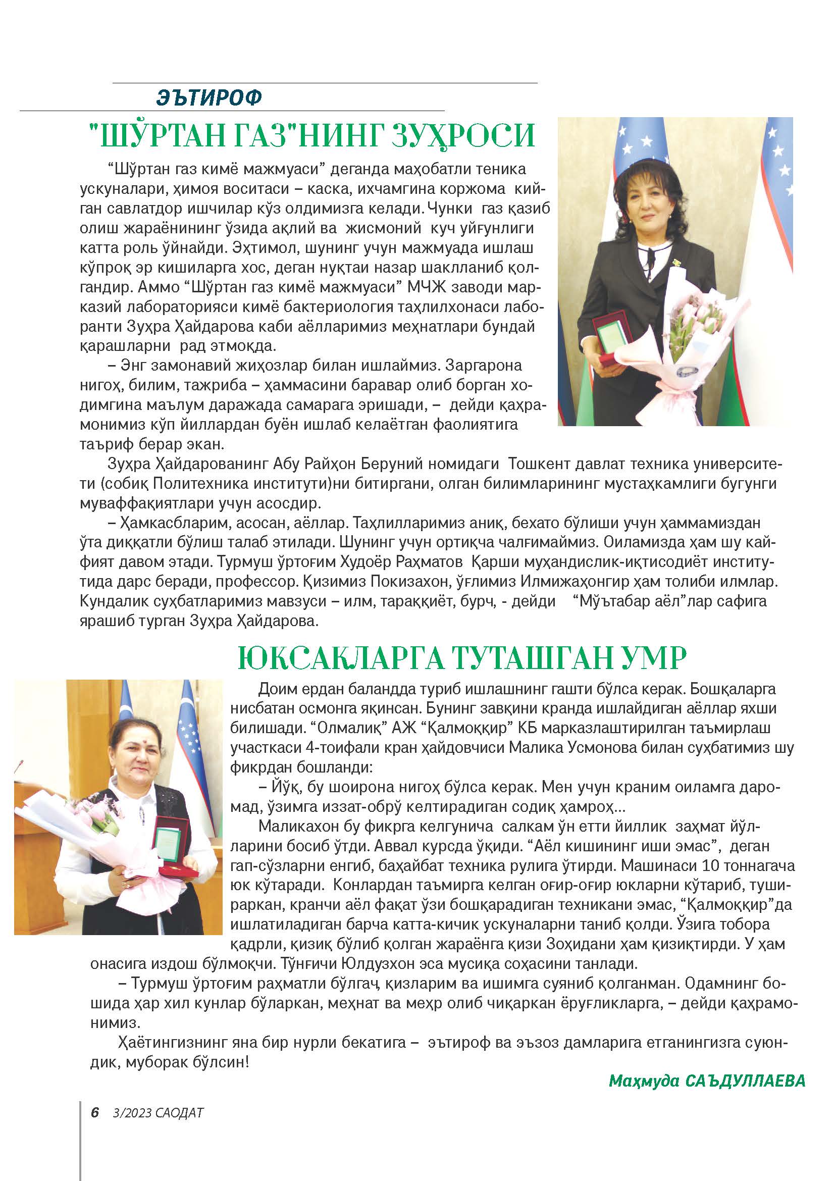 “Шўртан газ кимё мажмуаси” деганда маҳобатли теника ускуналари, ҳимоя воситаси – каска, ихчамгина коржома кийган савлатдор ишчилар кўз олдимизга келади. Чунки газ қазиб олиш жараёнининг ўзида ақлий ва жисмоний куч уйғунлиги катта роль ўйнайди. Эҳтимол, шунинг учун мажмуада ишлаш кўпроқ эр кишиларга хос, деган нуқтаи назар шаклланиб қолгандир. Аммо “Шўртан газ кимё мажмуаси” МЧЖ заводи марказий лабораторияси кимё бактериология таҳлилхонаси лаборанти Зуҳра Ҳайдарова каби аёлларимиз меҳнатлари бундай қарашларни рад этмоқда.