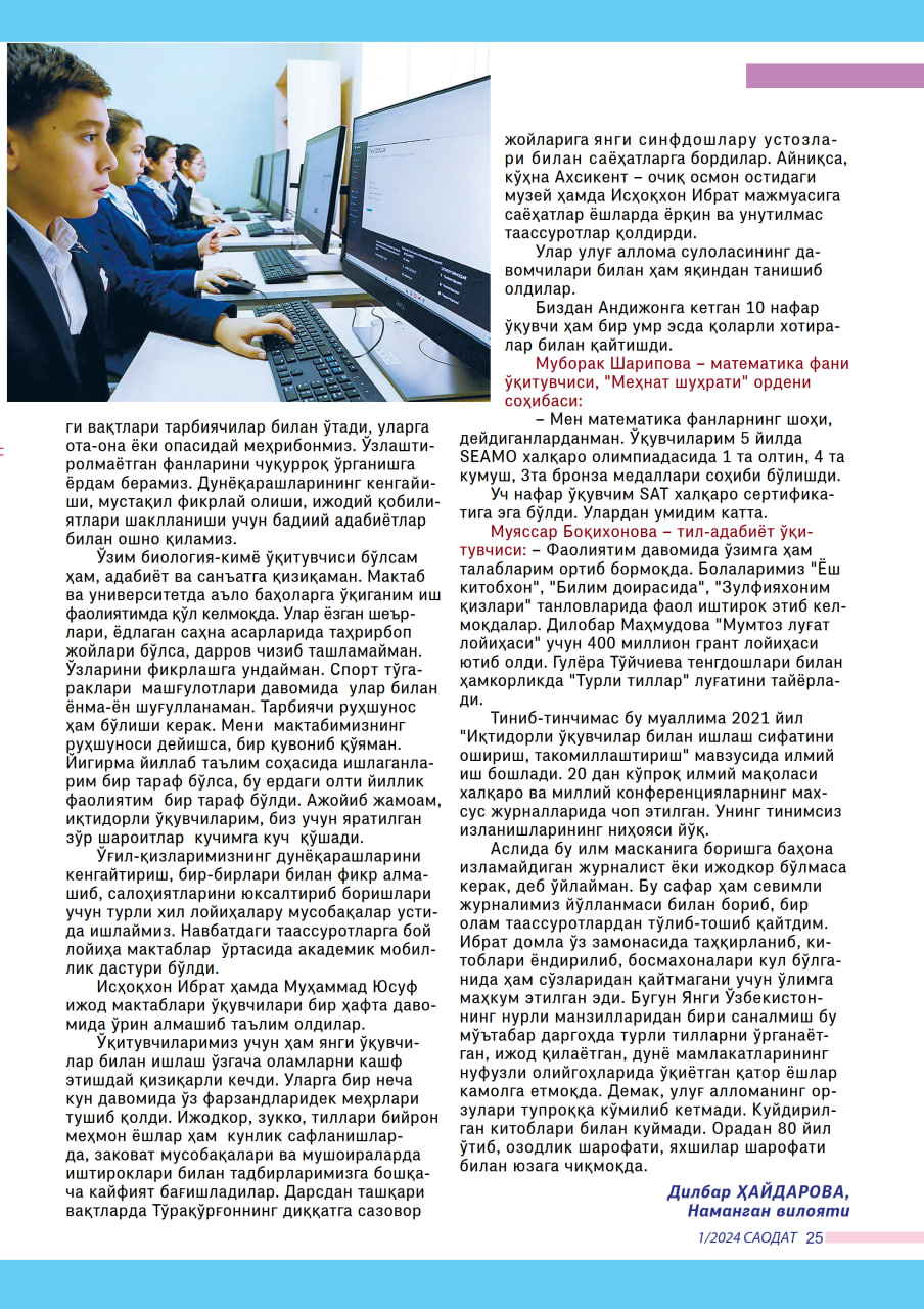 Муяссар Боқихонова – тил-адабиёт ўқитувчиси: – Фаолиятим давомида ўзимга ҳам талабларим ортиб бормоқда. Болаларимиз "Ёш китобхон", "Билим доирасида", "Зулфияхоним қизлари" танловларида фаол иштирок этиб келмоқдалар. Дилобар Маҳмудова "Мумтоз луғат лойиҳаси" учун 400 миллион грант лойиҳаси ютиб олди. Гулёра Тўйчиева тенгдошлари билан ҳамкорликда "Турли тиллар" луғатини тайёрлади.