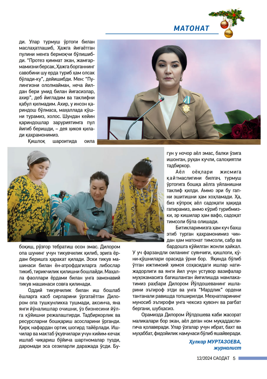 Оддий тикувчилик билан иш бошлаб ёшларга касб сирларини ўргатаётган Дилором опа тушкунликка тушмади, аксинча, яна янги йўналишлар очишни, ўз бизнесини йўлга қўйишни режалаштирди. Тадбиркорлик ва ресурсларни бошқариш асосларини ўрганди. Қирқ нафардан ортиқ шогирд тайёрлади. Ишчилар ва мактаб ўқувчилари учун кийим-кечак ишлаб чиқариш бўйича шартномалар тузди, даромади эса сезиларли даражада ўсди. Бугун у ночор аёл эмас, балки ўзига ишонган, руҳан кучли, салоҳиятли тадбиркор.